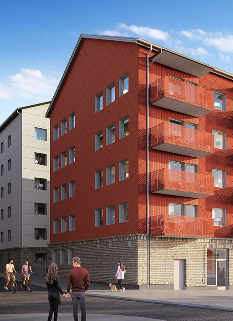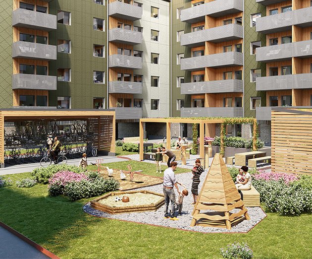 Kvarterens hus ramar in de gröna innergårdarna, med entréer som möter gatan. Arkitekturen har varierande höjd och material som skapar en levande stadsmiljö. I mitten av området kommer kommunen att anlägga ett torg. Hitta ditt drömhem bland 1–4:or för unga och gamla, stora som små familjer. Hela området beräknas vara klart under 2026.